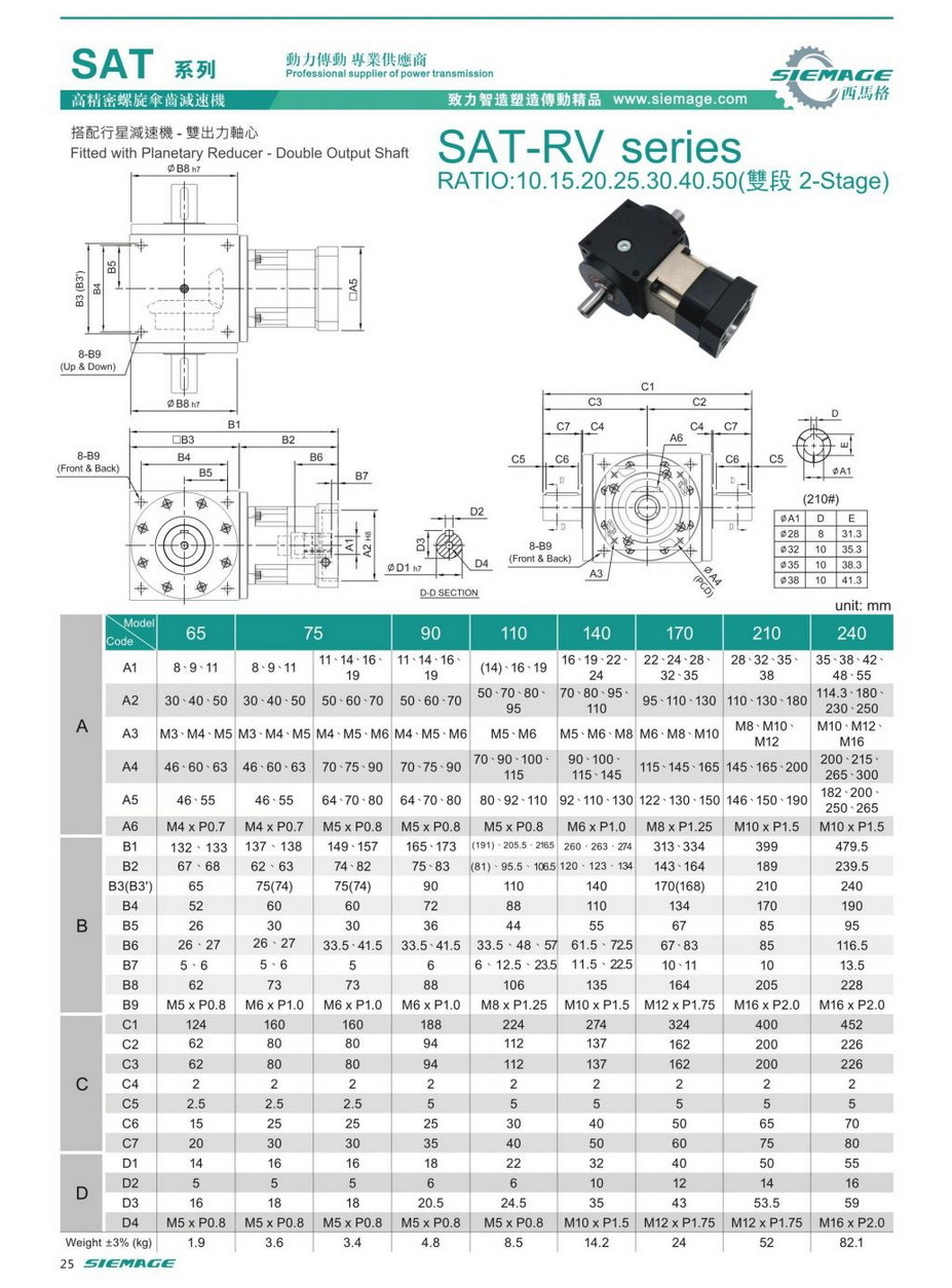 螺旋锥齿轮减速器双段的型号有SAT65,SAT75,SAT90,SAT110,SAT140,SAT170,SAT210等,减速比有1:10,1:15,1:20,1:25,1:30,1:40,1:50等,入力可配各种伺服电机,步进电机,直流电机等。螺旋锥齿轮减速器双段入力轴及出力轴均可特殊加工,订制,满足各种需求。